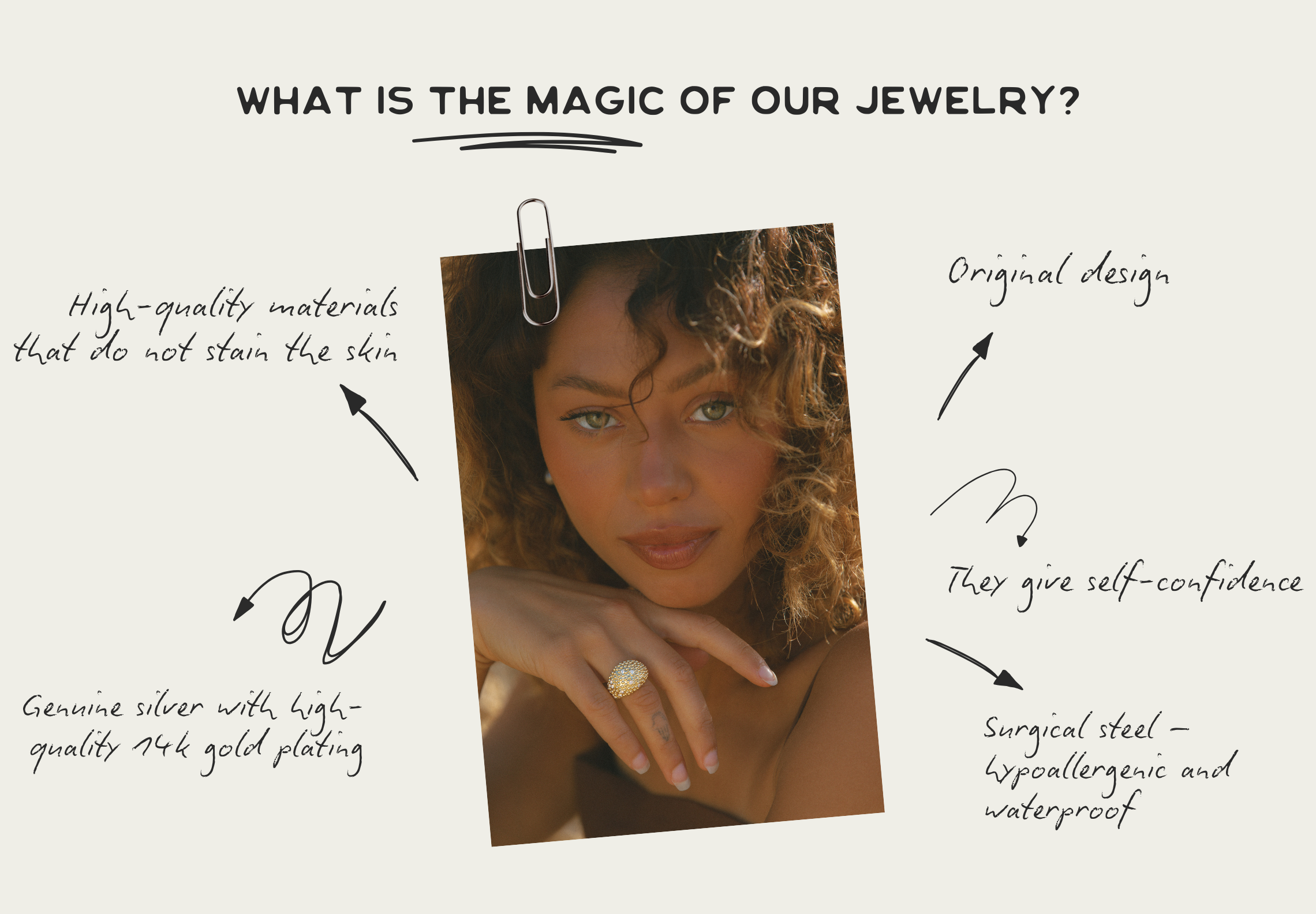 I make jewelry for women who don't want to blend in. The kind that highlights their personality, not just their outfit. I create original and affordable pieces that have soul. Find out more about our brand →