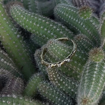 A delicate, open ring inspired by the irregular structure of stone and the natural lines of the mountain landscape. The organically shaped surface feels raw and authentic, as if shaped by time and the elements. Tiny cubic zirconias are set along the line of the ring like points of light that gently reflect the light.