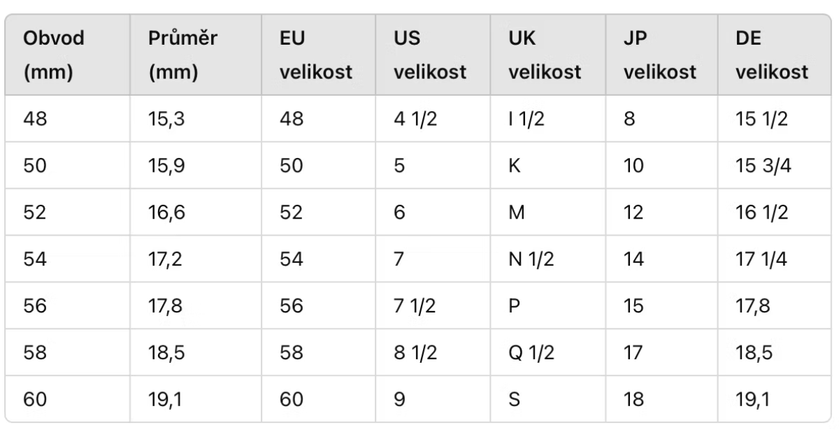 Většina našich prstýnků je univerzální velikosti s tím, že se dají zmenšovat a zvětšovat. Pokud však u prstýnku najdete nabídku velikostí, níže uvedená tabulka vám pomůže určit správnou velikost. Pro určení velikosti prstenu můžete změřit vnitřní obvod nebo průměr prstenu, který vám dobře sedí. Kdykoliv si u nás můžete domluvit schůzku v showroomu na tomto odkazu: https://aurosa-s-r-o.reservio.com, kde si můžete všechny prstýnky osobně vyzkoušet.